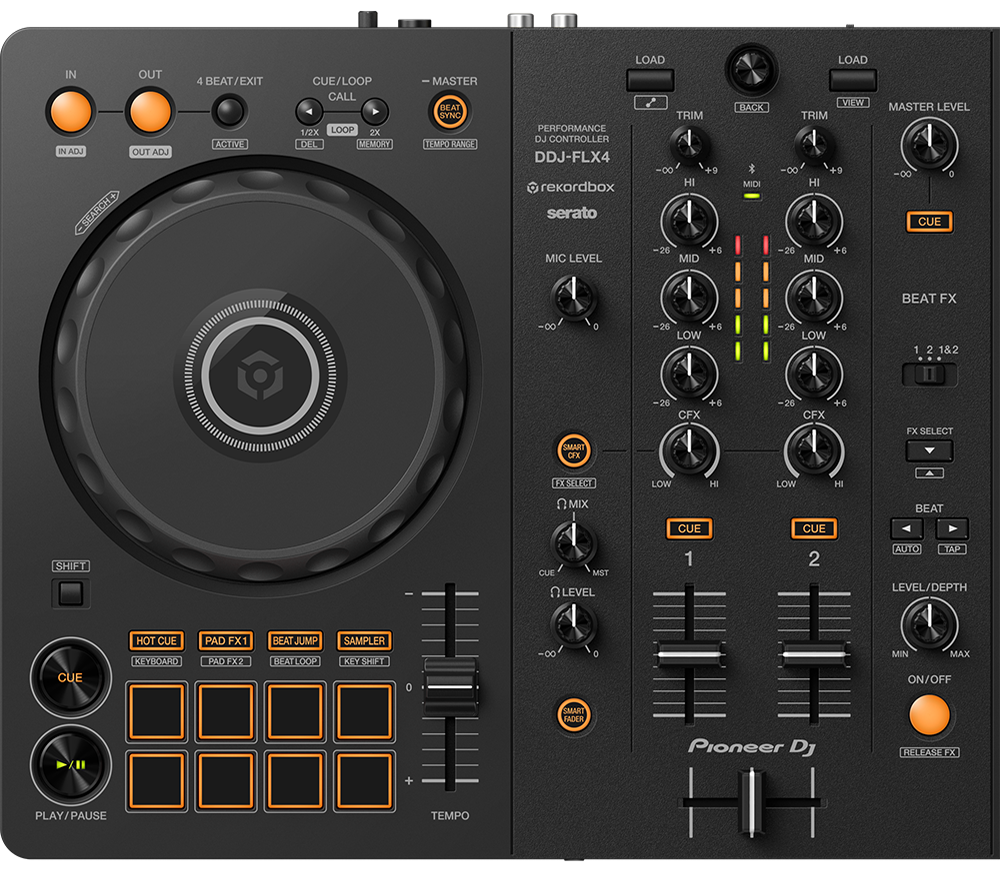 The layout of the controls on the DDJ-FLX4 makes it easy to learn to DJ and is inherited from professional Pioneer DJ products. Everything is simple to use and neatly arranged, which also makes the controller compact enough to take anywhere you want to practice or perform.