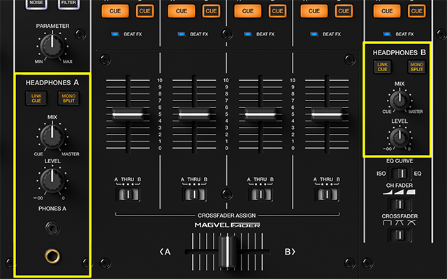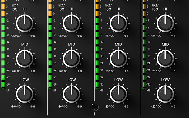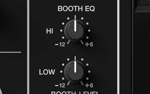 Plug in your headphones at the same time as another DJ and enjoy the freedom to monitor the channels you want to. With separate cue buttons, volume knobs, and mix balance knobs for each set of headphones, it’s easy for 2 DJs to cue up tracks during changeovers and back-to-back sets. Plus, with the 2-band booth EQ, you can change the high and low frequencies to complement the master output and match the mood in the booth to the feeling on the dancefloor.