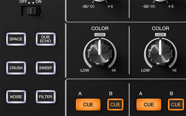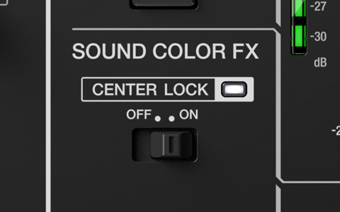 Turn on the brand-new Center Lock feature and, when you’re using the popular Sound Color FX, each knob will stop turning when you reach the center position. This means you can twist the knob as quickly as you like, taking the effect right up to the maximum of the hi, or down to the minimum of the low parameter, without the risk of going too far and switching to the opposite parameter. When you turn Center Lock off, the Sound Color FX knobs work in the same way as those on the DJM-900NXS2.