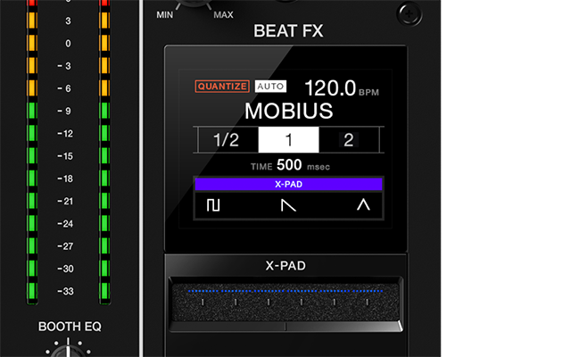 A new color display helps you to quickly and accurately understand the status of the selected effect, and it features lighting that corresponds with the X-Pad’s horizontal arrangement, enabling more intuitive control with a simple finger slide. You can use the X-Pad to change the Echo and Ping Pong effects to create a unique analog tape-style sound. And, within the 14 total Beat FX, there are 3 new ones (Mobius, Triplet Filter, and Triplet Roll) you can use to add extra variation to your performances.